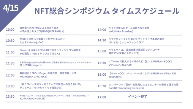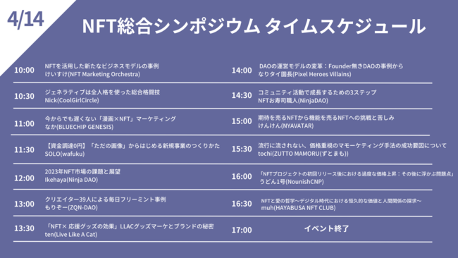 合同会社NFTオーケストラ(本社:東京都中央区)は、2023年4月14日(金)・15日(土)の2日間に渡り、国内NFTプロジェクトを集めた総合シンポジウムをオンラインにて開催いたしました。