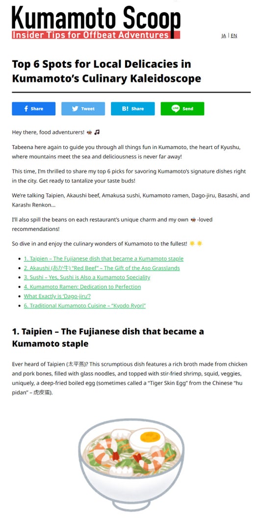 株式会社くまもとDMC(本社:熊本県熊本市、代表取締役:磯田淳)は、2024年2月1日(木)、熊本の食や観光の情報をインバウンド向けに英語で発信するWebサイト『Kumamoto Scoop -Insider Tips for Offbeat Adventures』を公開いたしました。