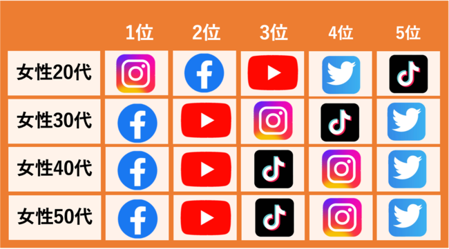 ・女性の30代・40代・50代ではFacebookの人気が1位である一方、20代ではInstagramの人気が1位である