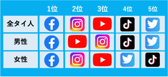 ・タイ人女性の人気SNSランキング:1位:Facebook、2位:Instagram、3位:YouTube