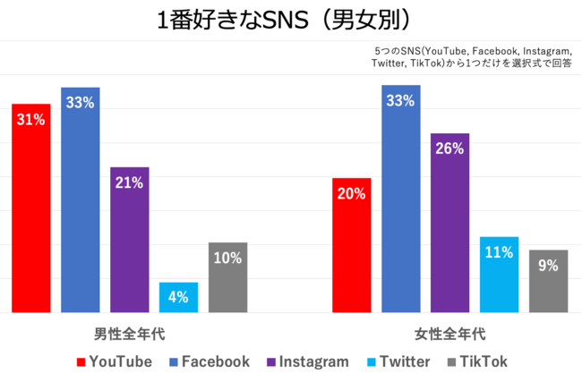 ※回答は、YouTube、Facebook、Instagram、Twitter、TikTokの5つのSNSとし、その中から選択式で最も好きなSNSを選ぶ方式