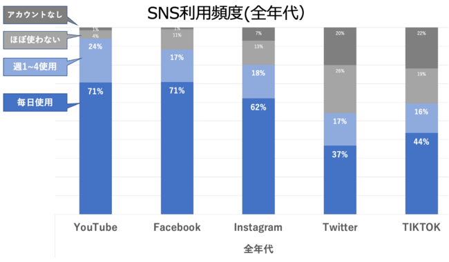本アンケートでは、調査対象のSNSは、YouTube、Facebook、Instagram、Twitter、TikTokの5つのSNSとしております。