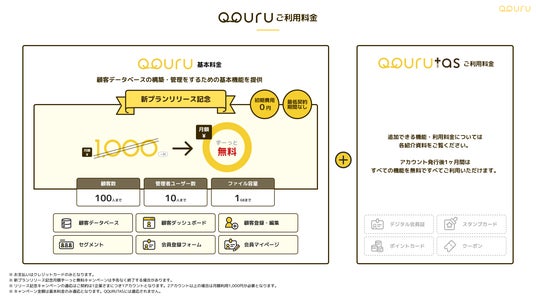 中小企業向けデジタルマーケティングサービス「QQURU(くくる)」は、新プランを2024年9月4日より販売開始いたします。新プランでは初期費用0円・月額基本料金1,000円で本格的な顧客データベースの構築、セグメント設計を行う事ができます。