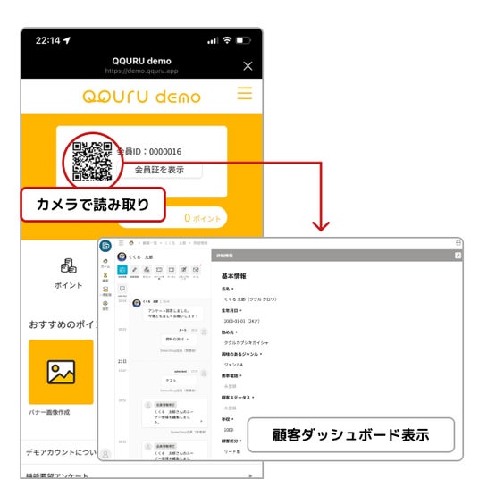 QRコード会員証を管理者画面から読み込むことで瞬時に該当顧客のダッシュボードにアクセスすることが可能です。もちろん、登録データによる検索を行うこともできます。