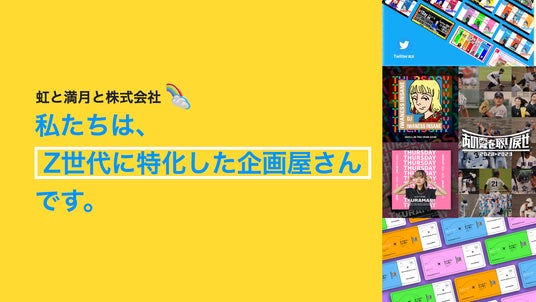 虹と満月と株式会社は、F0/F1層、M0/M1層(Z世代)に特化した企画・PR・マーケティングを得意とする企画カンパニーです。現代のSNSでの就活の先駆けとなった“Twitter就活”や、社会課題をエンタメにと掲げてポップに楽しく社会貢献を行う“もうタブーじゃないプロジェクト”など、既存の概念を変える企画で「シェア」され、多くの人が「賛同」し、新たな「文化形成」を起こすコンテンツをつくるのが得意なZ世代集団として話題になりました。