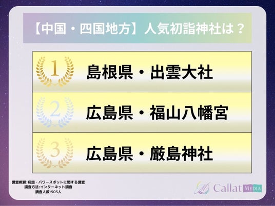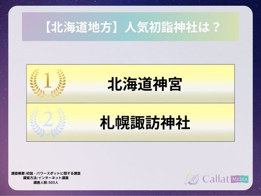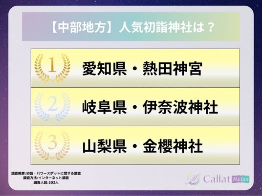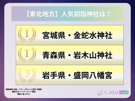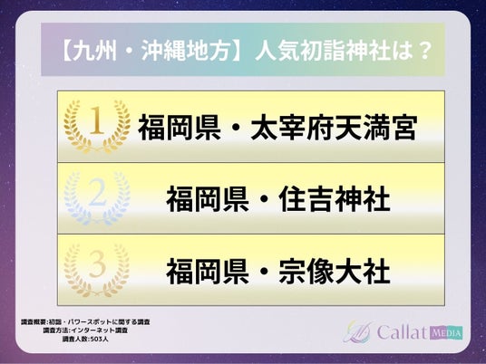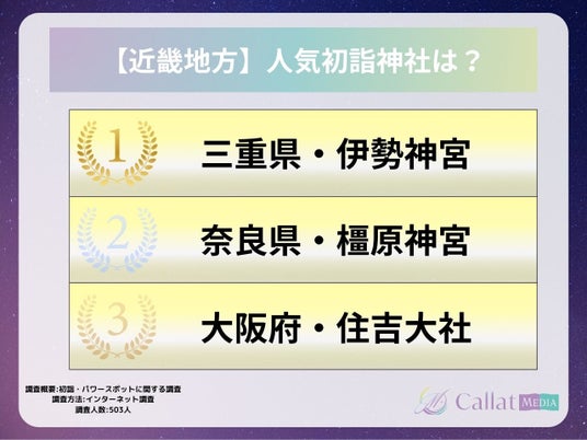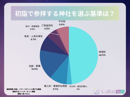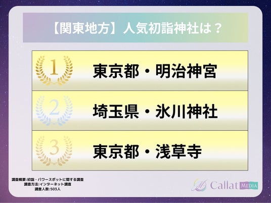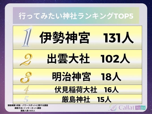 株式会社ALICORN(本社:東京都港区、代表取締役:松浦祐樹)が運営する女性向け占いメディア「Callat media」は、今年初詣に行った男女503人を対象に「参拝した神社・行ってみたいパワースポット」についてのアンケートを実施したので、その結果を報告します。