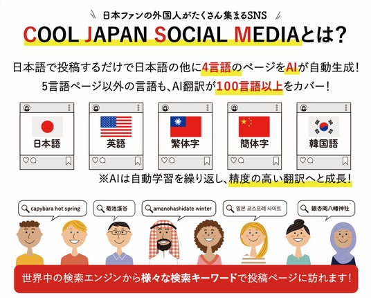 クールジャパンビデオで投稿をすると、AIが日本語の他に、英語・繁体字・簡体字・韓国語の投稿ページを自動生成。各言語の投稿ページが世界の検索エンジンに表示されることで多くの外国人が訪れます。一般のSNSとは異なり、資産ストック型のSNSのため投稿が無駄にならない仕組みとなっており、現在、全国多くの観光団体・自治体・企業の皆様にご利用いただいています。