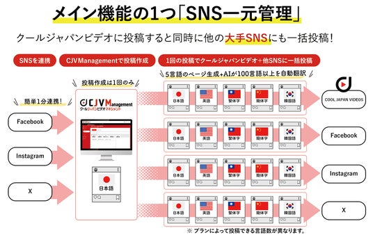 ・SNSの一括同時投稿機能「クールジャパンビデオ」内のSNS投稿はもちろん、主要の大手SNSプラットフォーム(今回のリリースではFacebook、Instagram、X)への一括同時投稿が可能です。