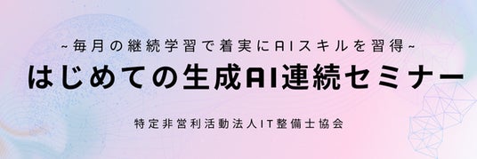 ITスキルの習得および資格認定を行う特定非営利活動法人 IT整備士協会(所在地:東京都新宿区、理事長:家喜 信行、以下「当協会」)は、2025年1月31日(金)より1年間の「はじめての生成AI」連続セミナーを開催いたします。