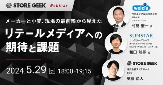 株式会社ストアギーク(本社:東京都港区、代表者:代表取締役 廣瀬隆昌、以下「ストアギーク」)は、ウエルシア薬局株式会社とサンスターグループでリテールメディア活用を推進するキーマンをゲストスピーカーとしてお招きし、2024年5月29日(水)18時より「メーカーと小売、現場の最前線から見えたリテールメディアへの期待と課題」と題した無料オンラインセミナーを開催いたします。