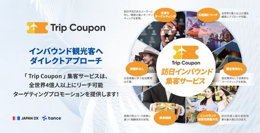 tance株式会社(本社:東京都新宿区、代表取締役社長:中井 和寛、以下tance)とJapan DX株式会社(本社:東京都港区、代表取締役:陳清揚、以下 Japan DX)は、2024年9月5日(木)より、店舗向けのサービスプラットフォーム「tance mall(タンスモール)」において、Ctripユーザー向けのクーポン掲載サービス「Trip Coupon(トリップクーポン)」の提供を開始しました。なお、本サービスの「tance mall」への営業推進は、JCBグループ*をはじめとした営業パートナーが担います。