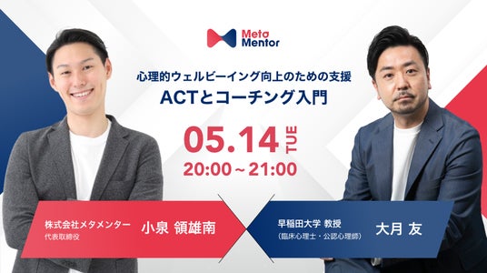 株式会社メタメンター(代表取締役社長:小泉 領雄南、本社:東京都渋谷区、以下メタメンター)は、行動分析学、臨床心理学を専門とする早稲田大学 大月友教授を招き、2024年5月14日にオンラインで「心理的ウェルビーイング向上のための支援: ACTとコーチング入門」と題した無料セミナーを開催します。