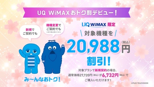 UQ WiMAXオンラインショップでは、対象機種のご購入と同時に対象の料金プランにご加入いただくと機種代金から新規契約の場合は20,988円(税込)、機種変更の場合は17,820円(税込)を割引する「UQ WiMAXおトク割を実施中です。