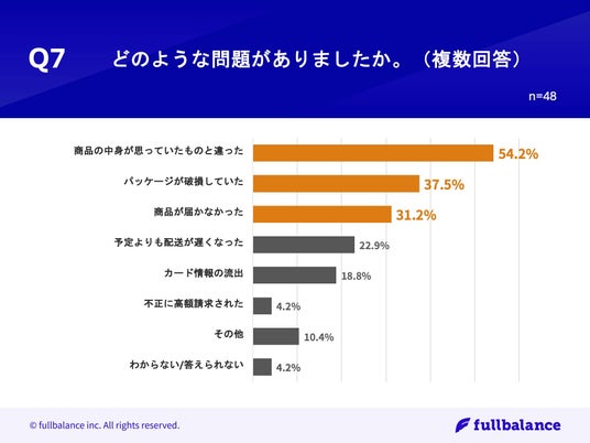 「商品の中身が思っていたものと違った」が54.2%、「パッケージが破損していた」が37.5%、「商品が届かなかった」が31.2%という回答となりました。