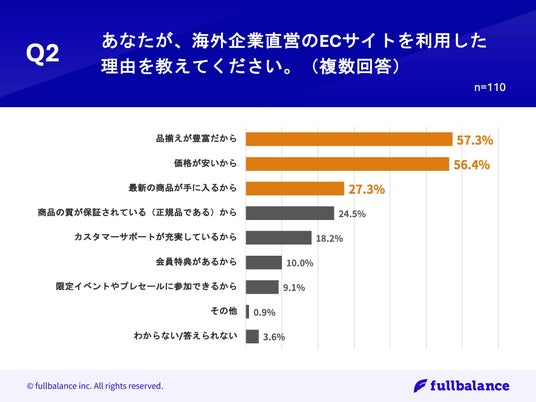 「Q2.あなたが、海外企業直営のECサイトを利用した理由を教えてください。(複数回答)」(n=110)と質問したところ、
