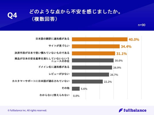 「日本語の翻訳に違和感がある」が40.0%、「サイトが見づらい」が34.4%、「決済手段が日本で使い慣れていないものである」が31.1%という回答となりました。