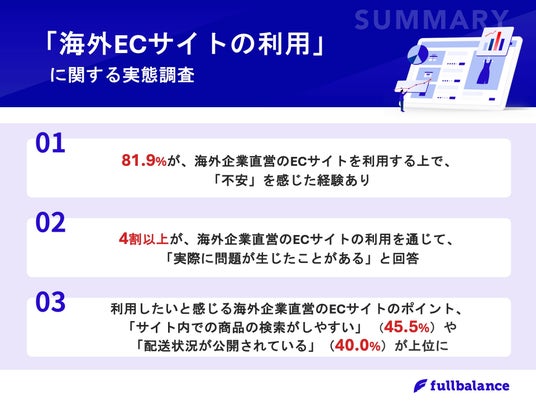株式会社フルバランス(本社:東京都新宿区、代表取締役:原田 真緒)は、直近1年以内に海外企業が直接運営するECサイトを利用したことのある方110名を対象に、海外ECサイトの利用に関する実態調査を実施しましたので、お知らせいたします。