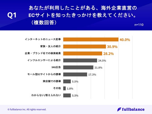 「Q1.あなたが利用したことがある、海外企業直営のECサイトを知ったきっかけを教えてください。(複数回答)」(n=110)と質問したところ、