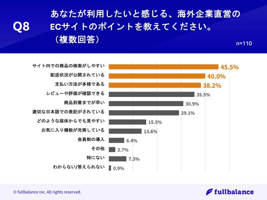 「Q8.あなたが利用したいと感じる、海外企業直営のECサイトのポイントを教えてください。(複数回答)」(n=110)と質問したところ、