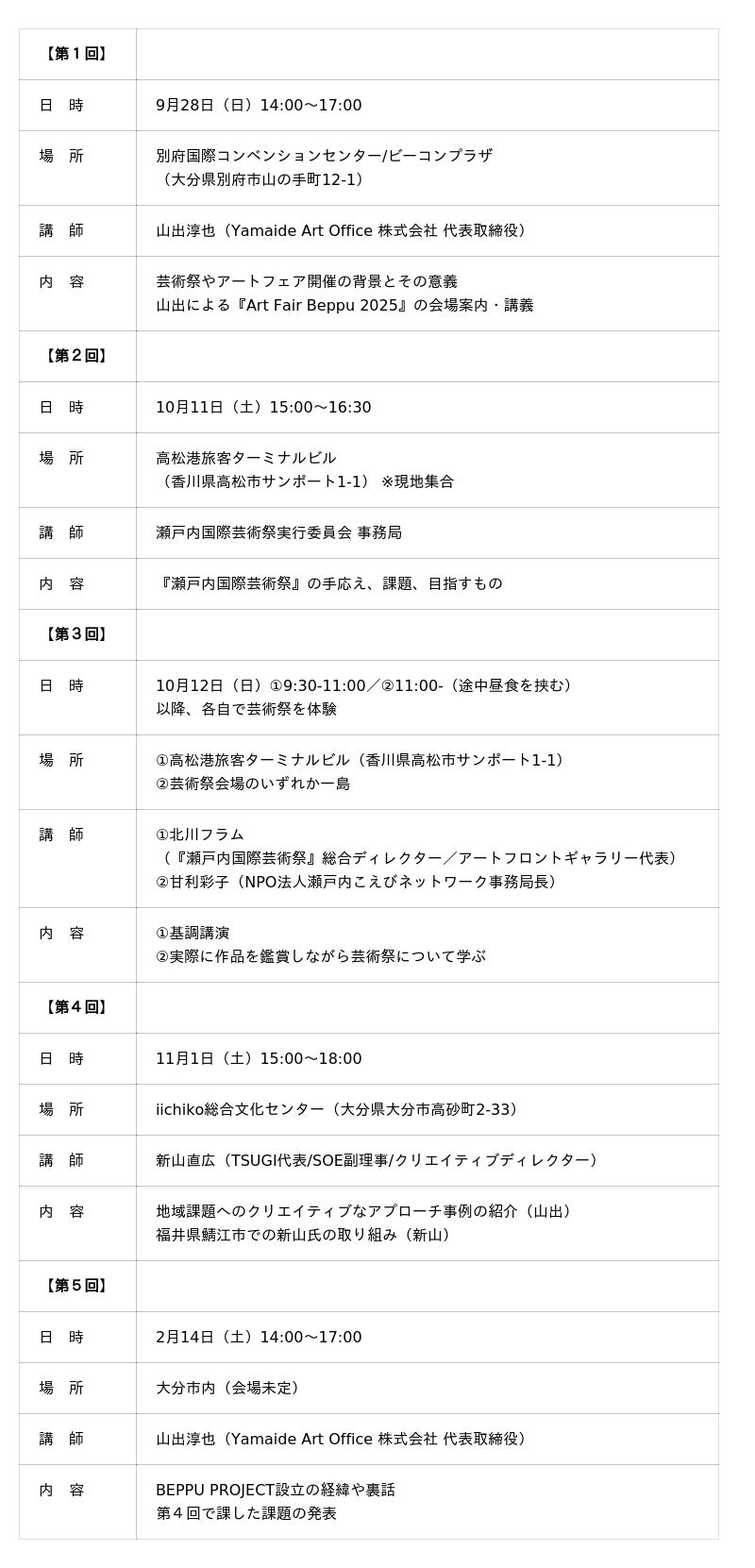 本講座のファシリテーターは、2005年に大分県別府市でBEPPU PROJECTを立ち上げ、国内最大級のアートNPOへと成長させた山出淳也が務めます。山出の長年の経験・経営手法や、ゲスト講師が実践の現場で培った経験や考え方について学ぶことで、「芸術起業家」の育成に寄与することを目指します。