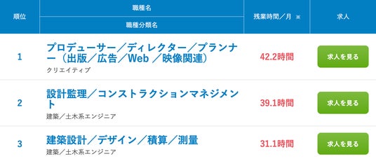 クリエイティブ業界は、長時間労働が常態化している業界として知られています。dodaが公開した平均残業時間ランキング【91職種別】では、平均残業時間の多い職種 ランキングTOP20で1位となっています。