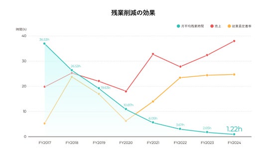 実際に残業削減を進めた結果、従業員の満足度を向上させただけでなく、会社の業績にも大きく影響がありました。グラフにも示されているとおり、月平均残業時間が減少するにつれて売上と従業員定着率が向上しています。