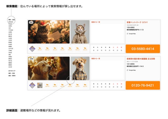 葬儀以外にも役立つしつけ教室、トレーニング、24時間診療、介護、リハビリなど、45種類以上のカテゴリに対応し、飼い主の多様なニーズに合わせて情報を検索できるよう整備しています。