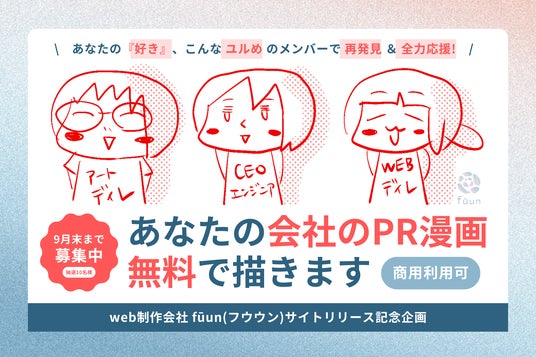 株式会社fūun(東京・新宿/代表 鷲尾和子、以下fūun)は、コーポレートサイト公開記念企画として、8月1日(木)より『あなたの会社のPR漫画、無料で描きますキャンペーン』を実施いたします。