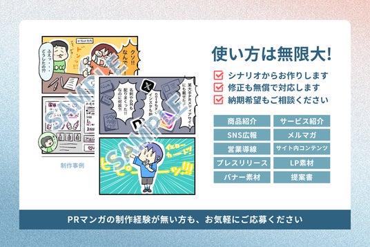 9月末までの期間中にお申し込み頂いた抽選10名様に、PRや広報でお使いいただける、商用利用可のオリジナル漫画をお作りいたします。