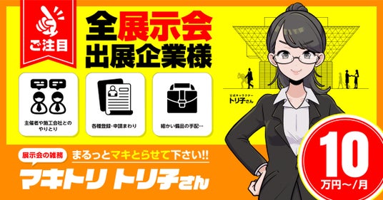 展示会伴走サービス「展示会のプロ」や初期費用0円、成功報酬型で展示会出展ができる「展示会ゼロ」を運営する株式会社アポロ(本社:東京都港区、代表取締役社長:飯島 隼人)は、展示会出展時に発生する雑務を月額10万円~でまるっと巻き取るアシスタントサービス「展示会の雑務 マキトリ トリ子さん」を提供することをお知らせします。