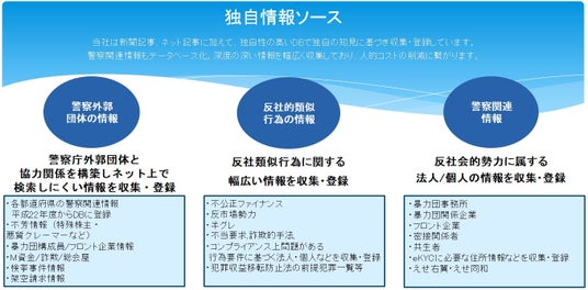 国内外の公開された反社会的勢力に関する情報(警察情報等)を常に最新の状態に保ち、企業が必要なときにすぐに反社チェック・コンプライアンスチェックができる環境を提供します。