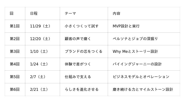 本プログラムはそうした課題を抱える方々に向けて、MVP(最小実行可能プロダクト)づくりから顧客理解、ブランド設計、販売導線、ビジネスモデル構築までを一貫して学べる3か月間の実践型講座として設計されています。