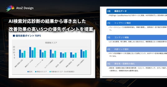 診断結果に基づく、改善効果の高い5つの優先ポイントを可視化。構造化データやトップページ構成など、AI検索に“選ばれる”ための具体策を提示しています。