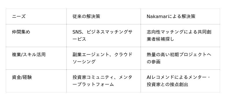 【Nakamarの差別化ポイント2.:熱中できる「複業」と出会う、採用ではない参画】「起業はしたいが、いきなり全てを投げ打つのは不安」という社会人層のニーズに応えるため、Nakamarは「ワクワクする複業・プロジェクト」の探しやすさに特化しています。
