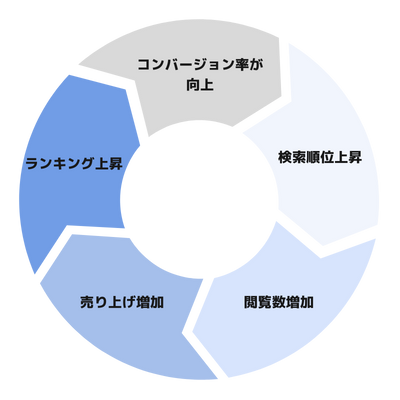 これがしっかりできている商品ページは、下記のようなAmazon特有の売れるサイクルに突入することができ、ライバル商品との価格競争に巻き込まれることなく売り上げを伸ばしていくことができます。