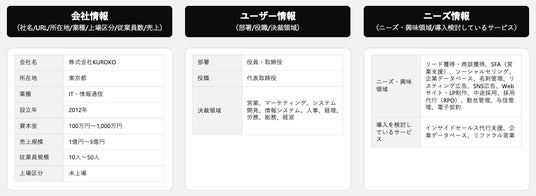 事前確認情報・企業情報(業種/売上規模/従業員規模/資本金規模/上場区分)・部署・役職情報(部署名/役職名)・決裁領域(決裁権限のある領域)・ニーズ情報(ニーズ・関心のある領域)・BANT情報(関心度合い/想定予算/導入時期/決裁権限)