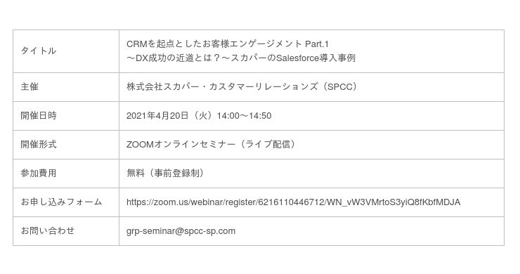 コンタクトセンター受託サービスを提供している株式会社スカパー・カスタマーリレーションズ(本社:東京都品川区、代表取締役社長:新巻康彦)は、4月20日(火))「CRMの導入・活用」をテーマに無料オンラインセミナーを開催いたします。 URL:http://www.spcc-sp.com/ お申し込みフォーム:https://zoom.us/webinar/register/6216110446712/WN_vW3VMrtoS3yiQ8fKbfMDJA