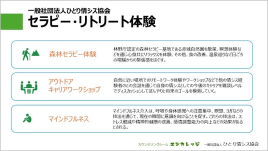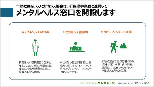 メンタルヘルス専門家による、群馬県内の経験豊富な臨床心理士・公認心理師が心理面接(カウンセリング)と心理検査を実施し、アセスメントに基づいた適切な初期対応を行うことを目的としたプログラムを実施します。プログラム参加者は、ひとり情シス協会関係者による情報交換やアドバイス、キャリアデベロップメントのワークショップやプロジェクトに参加頂けます。また、心身のリフレッシュを図るセラピー・リトリート体験として、群馬の豊富な自然環境の中での森林セラピー体験、食の改善、温泉巡り、森林でのリモートワーク経験プログラムを実施します。