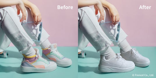 モデルのシューズ部分のみを撮影した商品に合成レタッチで差し替え