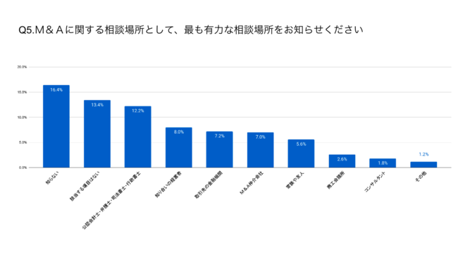 M&Aの相談場所の回答として、「知らない」と回答した経営者が16.4%と最も多い回答に