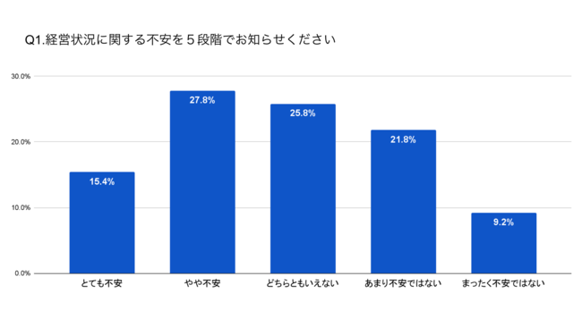 「とても不安」が15.4%、「やや不安」が27.8%、「あまり不安ではない」が21.8%、「全く不安ではない」が9.2%という結果になりました。多くの経営者が経営状況に不安を感じていますが、具体的にどのような課題を感じているのでしょうか?