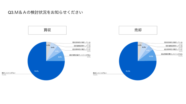 「買収」・「売却」ともに、経営者の75%以上がM&A検討したことがないと回答
