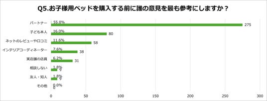 「Q5.お子様用ベッドを購入する前に誰の意見を最も参考にしますか?」の質問に対し、結果は次のとおりとなりました。