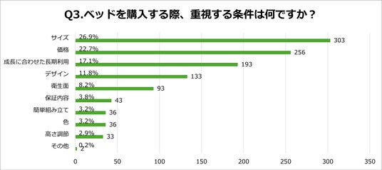 「Q3.ベッドを購入する際、重視する条件は何ですか?(最大3つまで選択)」の質問に対し、結果は次のとおりとなりました。