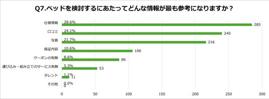 「Q7.ベッドを検討するにあたってどんな情報が最も参考になりますか?(最大3つまで選択)」の質問に対し、結果は次のとおりとなりました。