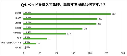 「Q4.ベッドを購入する際、重視する機能は何ですか?(最大3つまで選択)」の質問に対し、結果は次のとおりとなりました。
