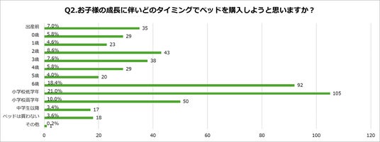 「Q2.お子様の成長にともない、どのタイミングでベッドを購入しようと思いますか(購入しましたか)?」の質問に対し、結果は次のとおりとなりました。