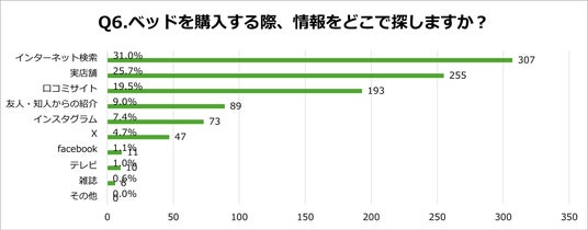 「Q6.ベッドを購入する際、情報をどこで探しますか?(最大3つまで選択)」の質問に対し、結果は次のとおりとなりました。