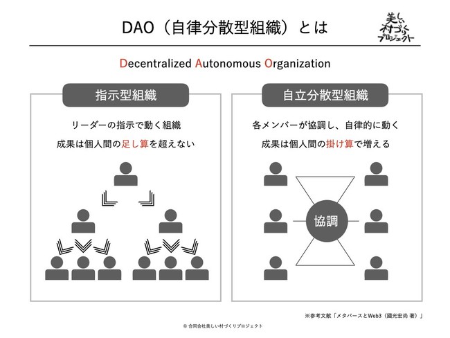 従来の中央集権的な『指示型組織』と比較して、DAOでは、同じ目的に協調するメンバーが、自律的に成果を生み出していくことを特徴としています。