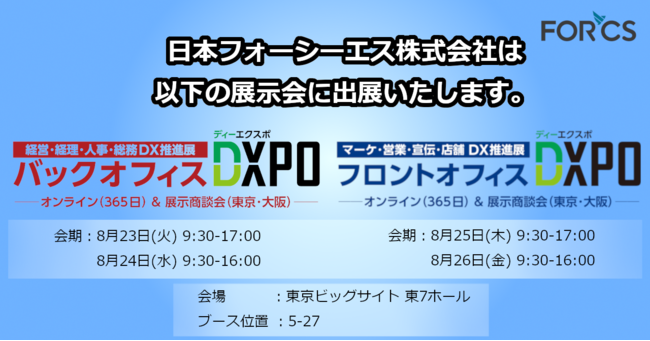 日本フォーシーエス株式会社(本社:東京都千代田区)は、8月23日(火)~26(金)に東京ビッグサイトにて初開催される「フロントオフィスDXPO東京 ‘22」及び、「バックオフィスDXPO東京 ‘22」に出展いたします。